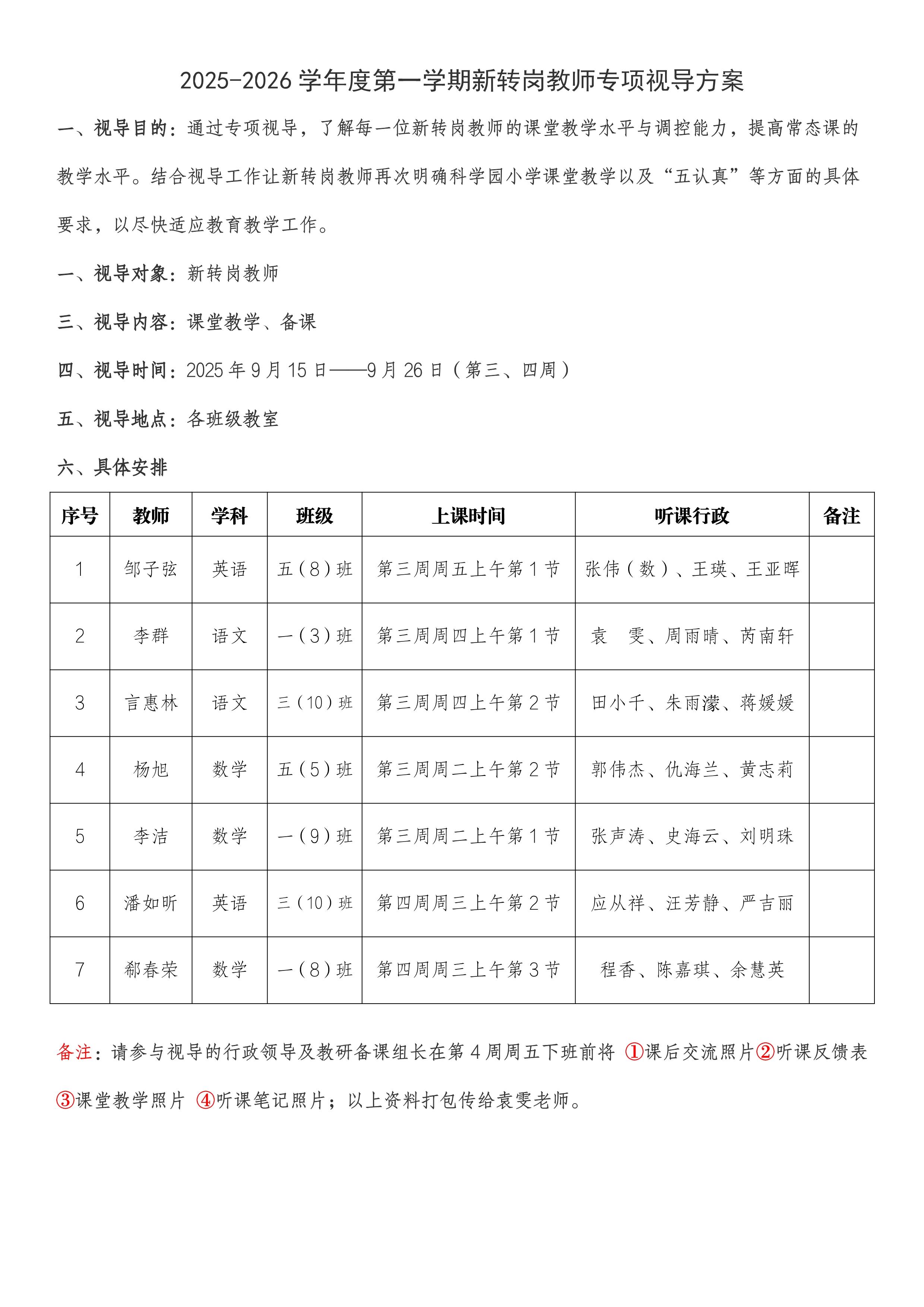 2025-2026学年度第一学期新转岗教师专项视导方案